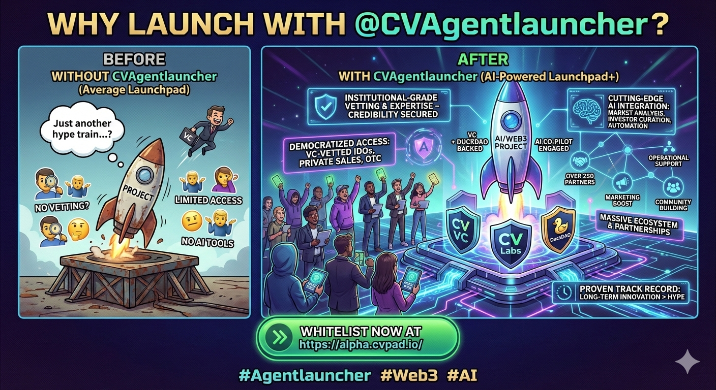 Meluncurkan proyek di bidang AI atau Web3 memang menarik — dan menantang. Perbedaan antara produk yang hanya sekadar wacana dan produk yang berkelanjutan serta layak didanai sering kali tergantung pada waktu, kredibilitas, serta peluncuran yang dipilih. Di sinilah @CVAgentlauncher (didukung oleh @CVPad_io) masuk: sebuah Launchpad+ yang menggabungkan ketatnya standar institusi, ekosistem mitra yang luas, serta alat berbasis AI untuk memberi para pendiri kesempatan nyata mencapai kesuksesan jangka panjang.