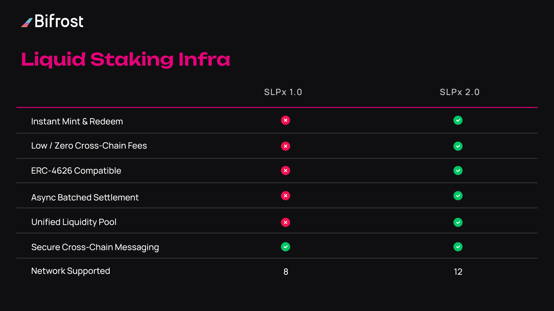 Peningkatan inti berasal dari SLPx 2.0. Dengan mengadopsi model pool async dan standar dompet ERC 4626, Bifrost menghilangkan banyak hambatan yang terlihat pada sistem staking lintas rantai sebelumnya. Pencetakan token instan, penarikan lebih cepat dan dibatch, serta biaya jauh lebih rendah karena operasi lintas rantai ditangani di latar belakang alih-alih per transaksi.