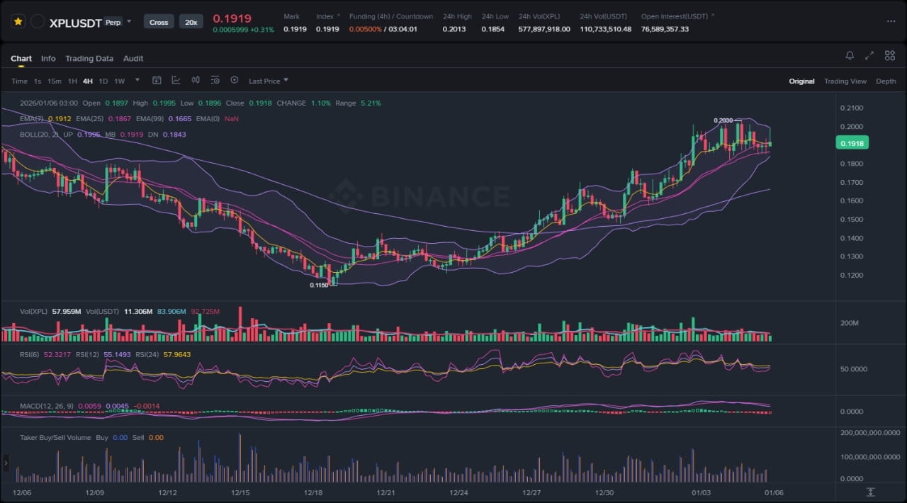 Aksi harga XPL mencerminkan struktur tren naik yang mencoba breakout dari rentang multi-minggu, dengan EMA 7-periode miring ke atas dan melintasi di atas EMA 25-periode yang datar, sementara EMA 99-periode memberikan dukungan dinamis dekat dengan level rendah terbaru. Candle diperdagangkan dalam setengah atas dari Bollinger Bands yang mengembang, menandakan ekspansi volatilitas setelah periode konsolidasi. Elemen yang dapat diamati termasuk kenaikan impulsif lima gelombang dari dasar rentang sekitar 0.13, diikuti oleh konsolidasi mirip bendera yang menolak bayangan bawah di 0.16, dan uji ulang swing tinggi lokal di 0.18 sebelum reversion rata menariknya kembali ke 0.17. Ini memposisikan XPL dalam saluran bullish, dengan harga menghormati tumpukan EMA saat kantong likuiditas terbentuk di bawah.