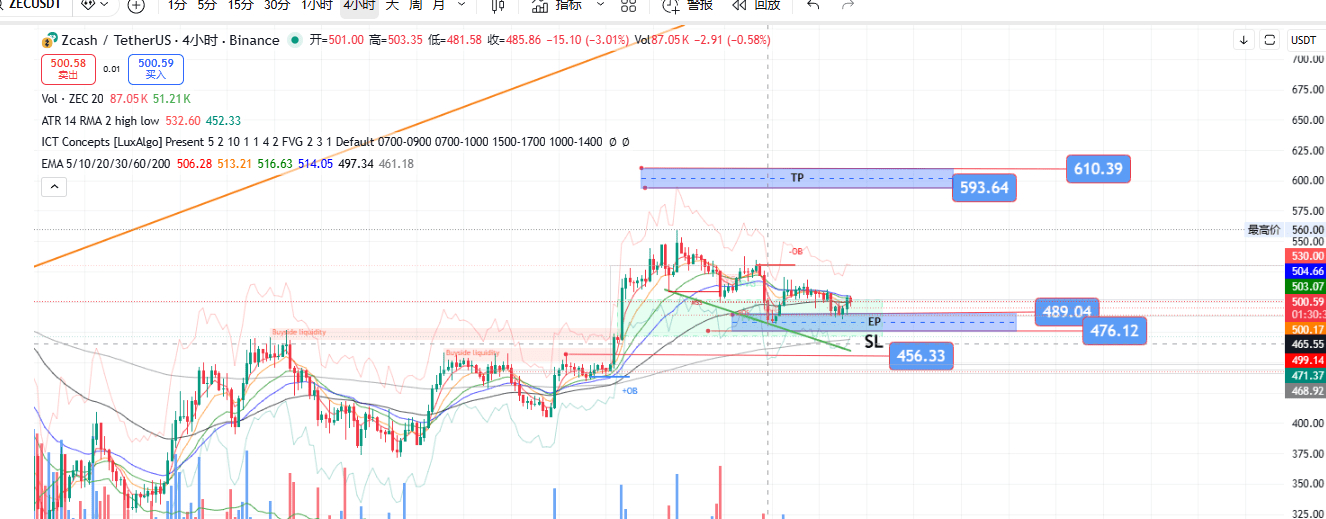2. $ZEC (grafik 4 jam, harga saat ini ≈502,8)