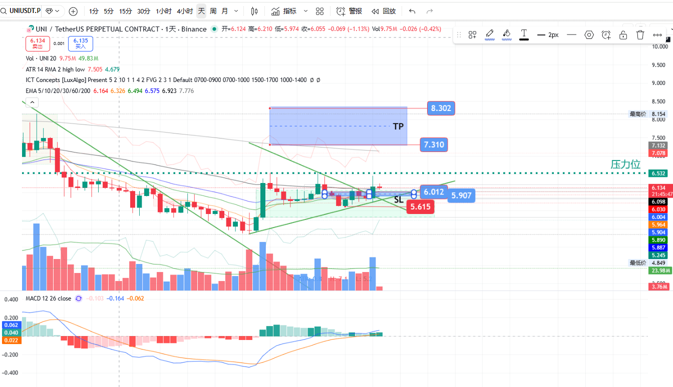 1. $UNI (grafik harian, harga saat ini ≈6,12)