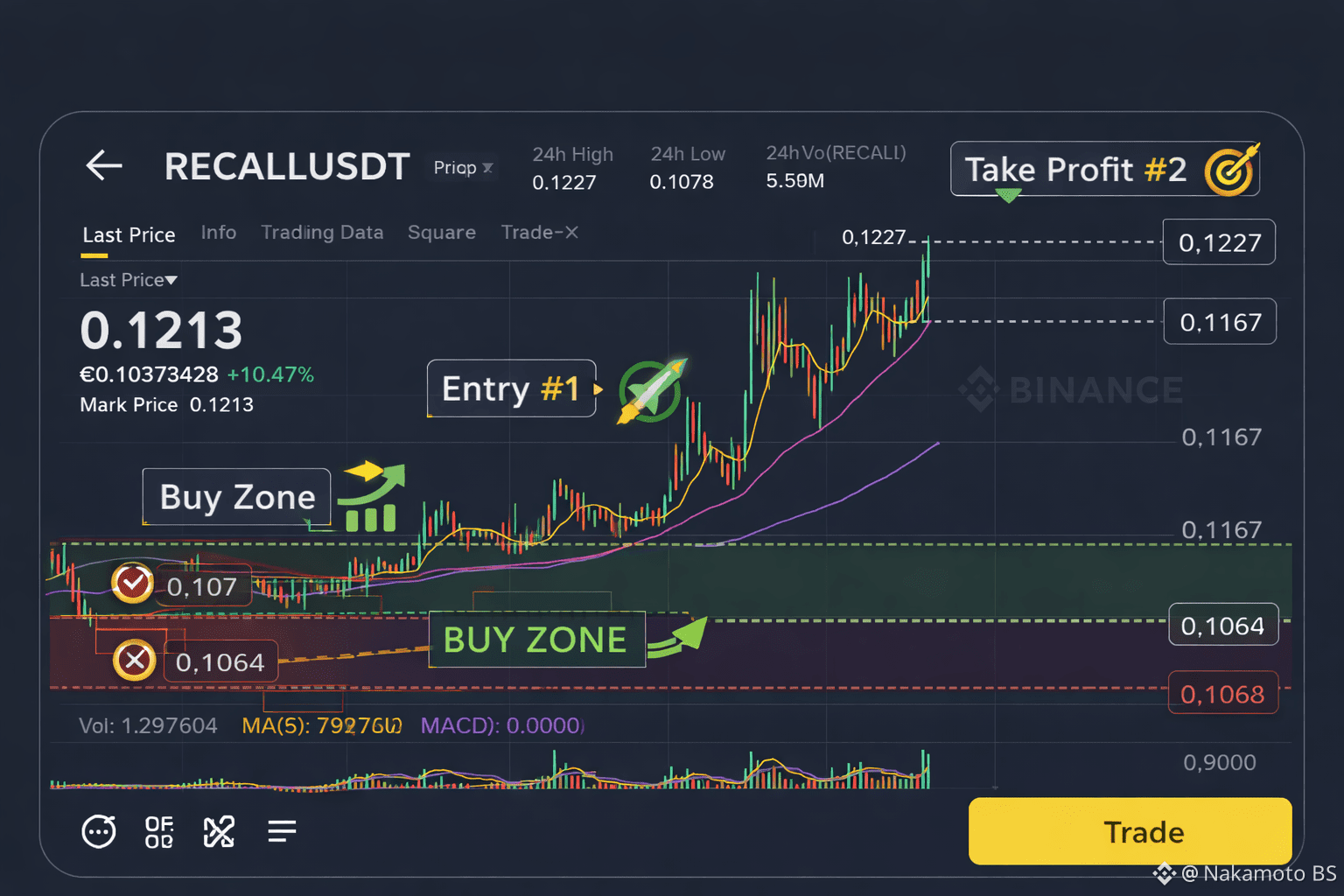 As long as the price holds above 0.1060, the bullish bias remains valid. Any pullback into the buy zone may offer a good opportunity to target higher levels.#RECALLUSDT #CryptoTrading #BฤฐNANCEFUTURES