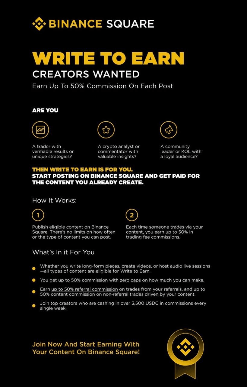 Write-to-Earn berarti Anda mendapatkan imbalan dengan menerbitkan konten yang disetujui di Binance Square