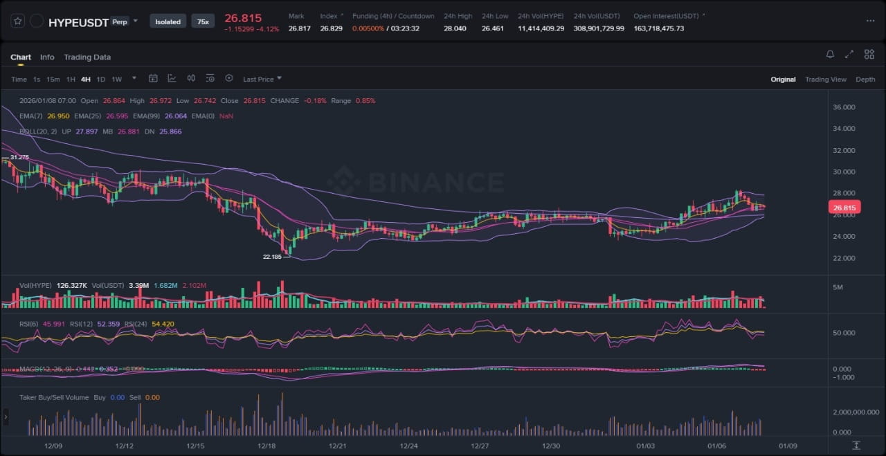Pasar cryptocurrency yang lebih luas sedang dalam fase penarikan ringan setelah awal minggu yang optimis, dengan Bitcoin mengalami penarikan singkat ke zona dukungan $91.000 dan Ethereum mengonsolidasikan diri di sekitar $3.200. Lingkungan makro ini mencerminkan mean reversion yang khas setelah kenaikan awal minggu, di mana kantong likuiditas di sekitar level psikologis menyerap tekanan jual sebelum rebound potensial. Untuk HYPE, diperdagangkan pada sekitar $28,15 berdasarkan data terbaru, token ini berada dalam rentang konsolidasi setelah pergerakan impulsif yang tajam lebih tinggi, dipengaruhi oleh dinamika pasar yang lebih luas. Indikator volume menunjukkan sedikit peningkatan minat beli, menunjukkan akumulasi alih-alih distribusi secara langsung, meskipun volatilitas tetap tinggi karena sensitivitas aset terhadap aliran sektor DeFi. Kunci dari snapshot ini adalah interaksi antara koreksi jangka pendek dan bias bullish yang mendasari, karena aksi harga HYPE mencerminkan ketahanan sektor di tengah ketidakpastian ekonomi global.