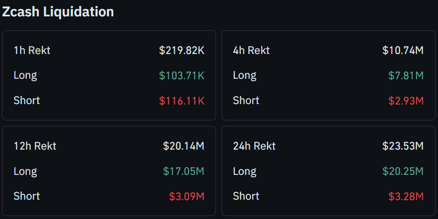Penjualan tersebut memicu serangkaian likuidasi paksa di pasar berjangka. Menurut data CoinGlass, Zcash melihat likuidasi total sebesar $23,53 juta dalam 24 jam terakhir—dengan posisi panjang mengalami kerugian besar sebesar $20,25 juta, sementara posisi pendek hanya menghadapi $3,28 juta. Ketidakseimbangan likuidasi yang sangat berat ini menunjukkan bagaimana para pembeli yang terlalu berleveraged tertangkap kaget, memicu penurunan lebih lanjut saat posisi ditutup secara paksa.