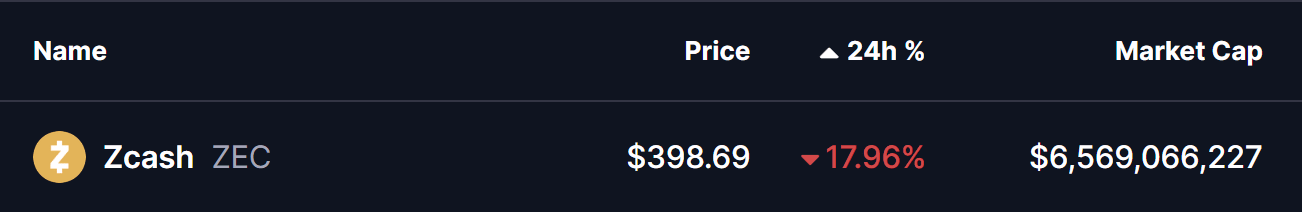 Hingga penulisan ini, 2026, ZEC saat ini diperdagangkan sekitar $398, menandai penurunan tajam hampir 18% dalam 24 jam terakhir. Penurunan ini menghapus banyak momentum reli baru-baru ini, dengan koin turun di bawah level psikologis kunci seperti $400 di tengah lonjakan volume dan ketakutan.