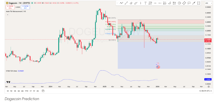 Di sisi bawah, harga mendekati dukungan kunci di sekitar $0,13, seperti yang ditunjukkan oleh level Fibonacci 1. Jika Dogecoin gagal mempertahankan dukungan di level ini, harga bisa turun lebih jauh menuju level $0,10.