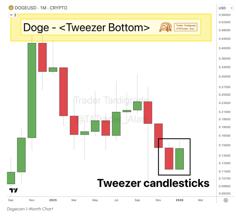 Di tempat lain, di X, analis Trader Tardigrade menunjukkan bahwa Dogecoin menunjukkan pola lilin Tweezer pada grafik bulanan, yang menandakan kemungkinan pembalikan bullish. Lilin-lilin ini mewakili harga antara $0,117 dan $0,156.