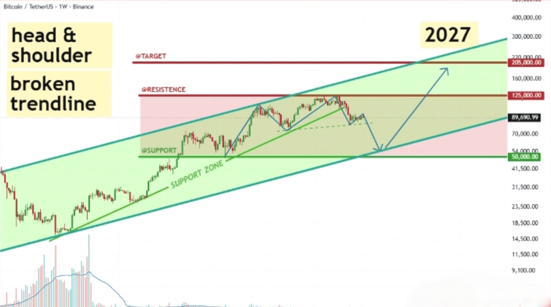Grafik mingguan $BTC mengonfirmasi pola Head & Shoulders bearish besar dan garis tren naik yang telah rusak. Perlu sangat berhati-hati karena penurunan menuju zona dukungan $50.000 tampak sangat mungkin.
