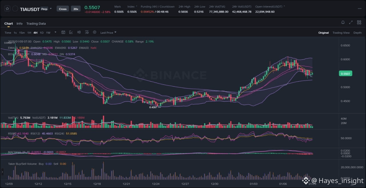 To gauge the trend strength, the Exponential Moving Averages (EMAs) provide critical context: the 7-period EMA has crossed below the 25-period EMA in a classic death cross, while both remain well below the 99-period EMA, which acts as dynamic resistance around 0.28. This EMA stack indicates no immediate uptrend resumption, placing TIA firmly in a downtrend rather than a range or breakout attempt. The Bollinger Bands further support this, with price hugging the lower band, signaling oversold conditions but no mean reversion yet, as the bands expand amid heightened volatility.