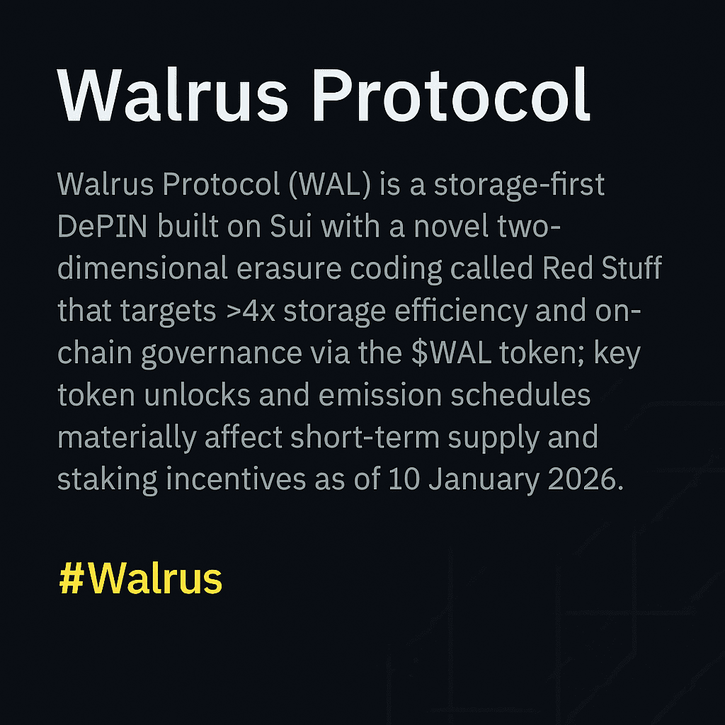 Protokol Walrus (@walrusprotocol) menempatkan dirinya sebagai jaringan staking DePIN yang dioptimalkan untuk penyimpanan dan bersifat native terhadap Sui dengan lapisan utilitas token yang berpusat pada $WAL . Analisis ini berfokus pada rekayasa inti protokol, dinamika token, ekonomi node, dan indikator yang dapat diukur dan relevan bagi integrator serta pemegang token. #Walrus