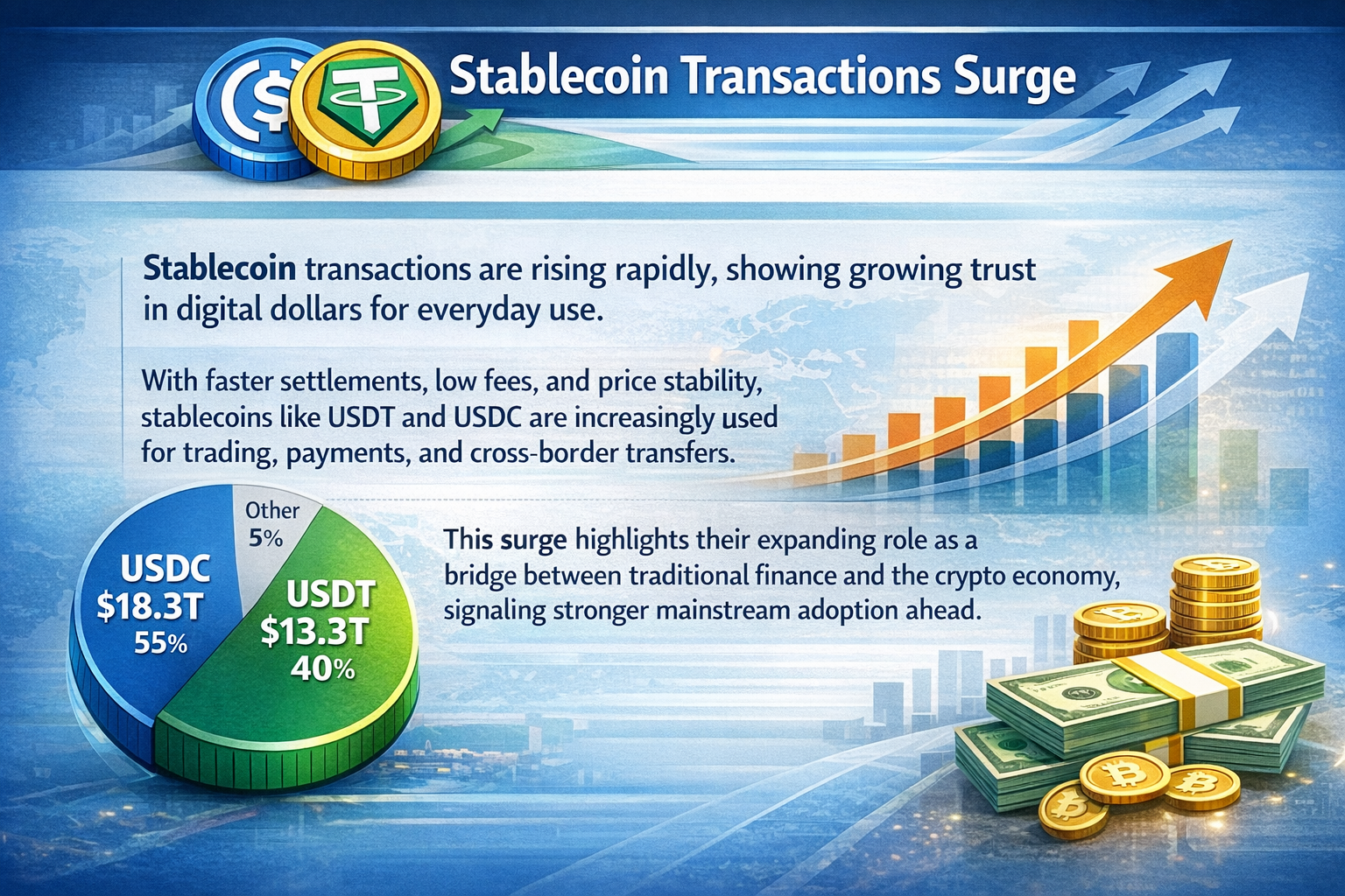 Transaksi stablecoin meningkat pesat, menunjukkan meningkatnya kepercayaan terhadap dolar digital untuk penggunaan sehari-hari. Dengan penyelesaian yang lebih cepat, biaya rendah, dan stabilitas harga, stablecoin seperti USDT dan $USDC semakin banyak digunakan untuk perdagangan, pembayaran, dan transfer lintas batas. Lonjakan ini menekankan peran mereka yang semakin luas sebagai jembatan antara keuangan tradisional dan ekonomi kripto, menandakan adopsi utama yang lebih kuat di masa depan.$BTC