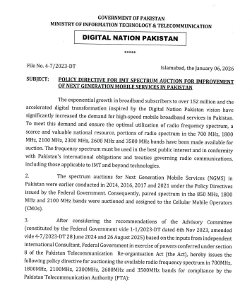 Pemerintah Pakistan telah mengeluarkan arahan kebijakan untuk lelang spektrum frekuensi radio yang akan datang yang bertujuan untuk meningkatkan layanan seluler generasi berikutnya. Arahan kebijakan ini, yang mengikuti strategi transformasi digital secara luas di negara tersebut, menguraikan proses lelang untuk band frekuensi utama, termasuk 700 MHz, 1800 MHz, 2100 MHz, 2300 MHz, 2600 MHz, dan 3500 MHz.
