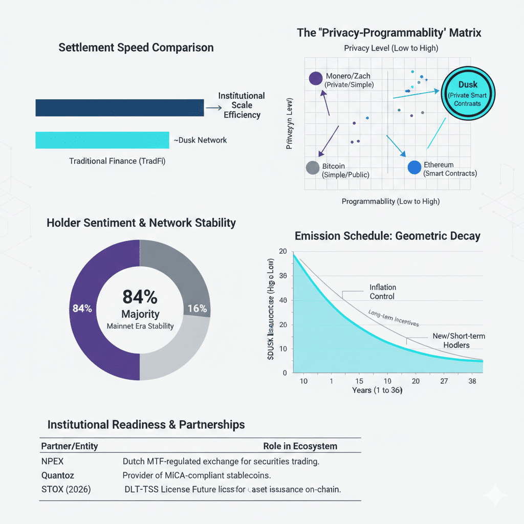 Di sinilah Dusk berbeda dari Monero atau Zcash. Jaringan-jaringan tersebut unggul dalam transfer nilai pribadi tetapi kurang dalam pemrograman untuk aplikasi keuangan kompleks. Dusk menggabungkan privasi dengan kontrak pintar lengkap Turing, memungkinkan pertukaran terdesentralisasi yang rahasia, protokol pinjaman pribadi, dan sekuritas yang ter-tokenisasi dengan kepatuhan yang terintegrasi.