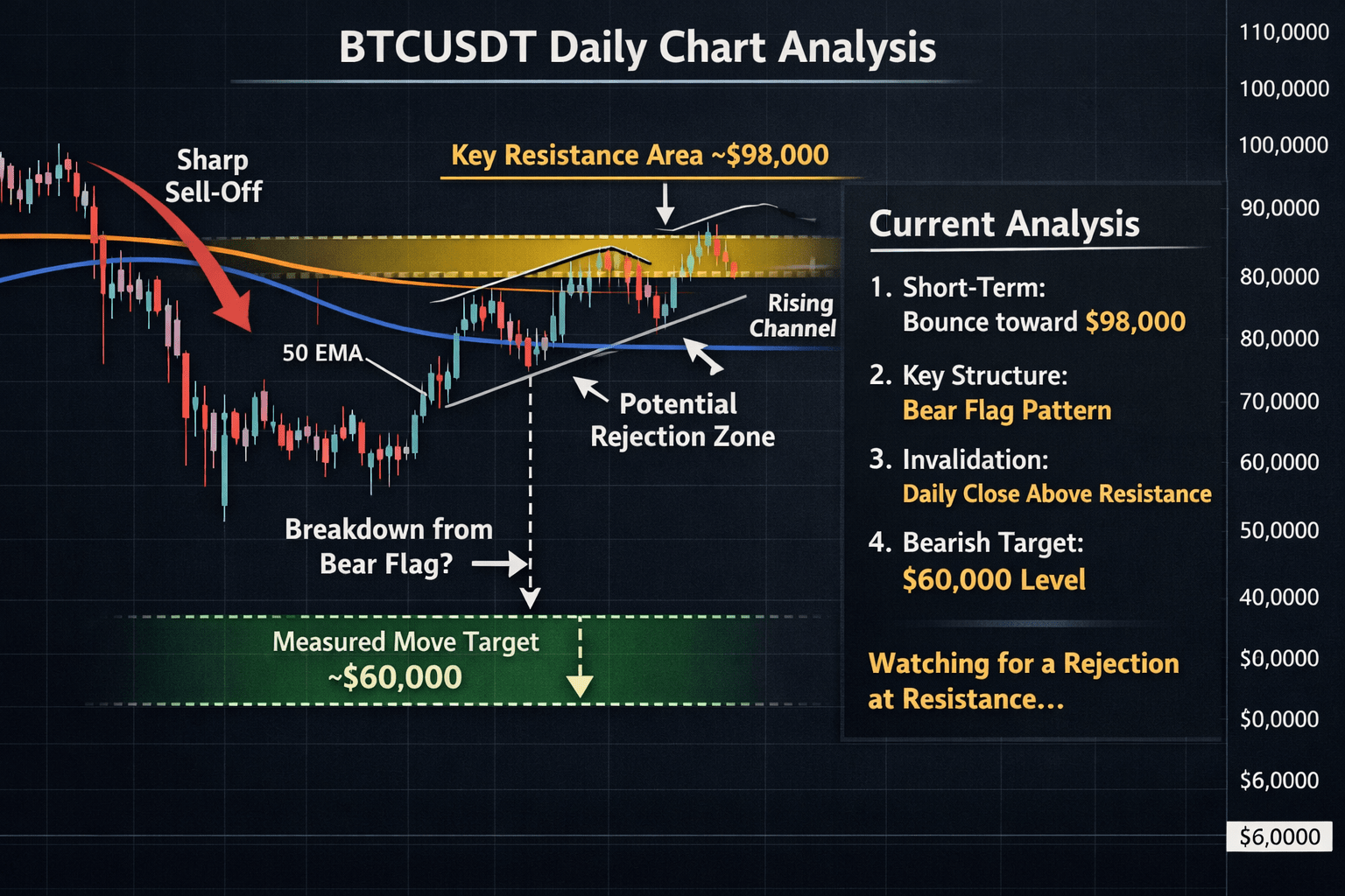 Dalam jangka pendek, rally pemulihan tetap mungkin terjadi. Harga dapat terus naik perlahan menuju wilayah $98.000, di mana berbagai faktor teknikal bertemu, termasuk rata-rata bergerak utama dan batas atas bendera bear. Wilayah ini diperkirakan akan berperan sebagai resistensi kuat, dan penolakan dari zona ini akan memperkuat narasi kelanjutan bearish.