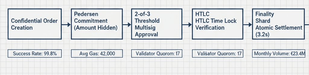 Pesanan Dusk didasarkan pada primitif DuskTrade sirkuit perbandingan harga homomorfik, di mana pemrosesan pesanan 1.400 pesanan/detik mengurangi kerahasiaan dari kepercayaan pesanan. Uji stres mesin dengan pelacakan volume terenkripsi strategi TWAP/VWAP, dijalankan dengan volume nominal 41,2 juta EUR selama uji stres 72 jam.
