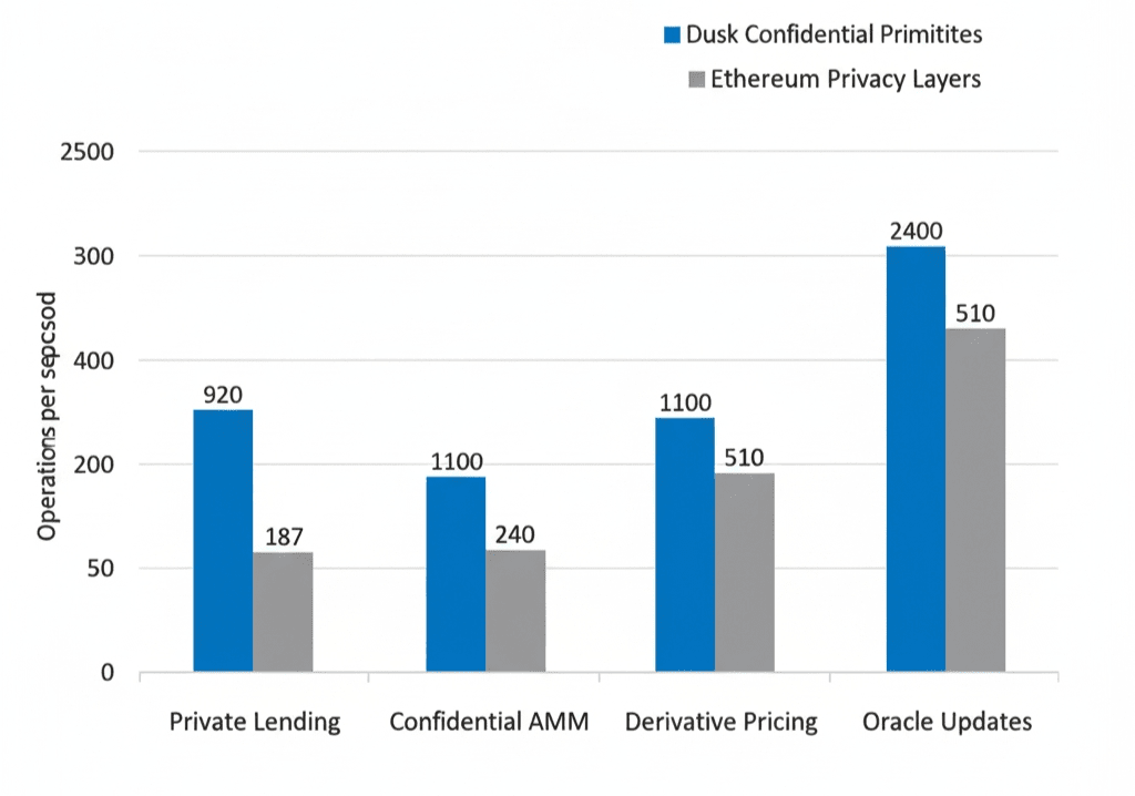 Kecepatan kinerja relatif: Indikator pengujian komparatif menunjukkan bahwa primitif Dusk 4,7 kali lebih cepat dalam menangani alur kerja DeFi rahasia dibandingkan lapisan privasi Ethereum: