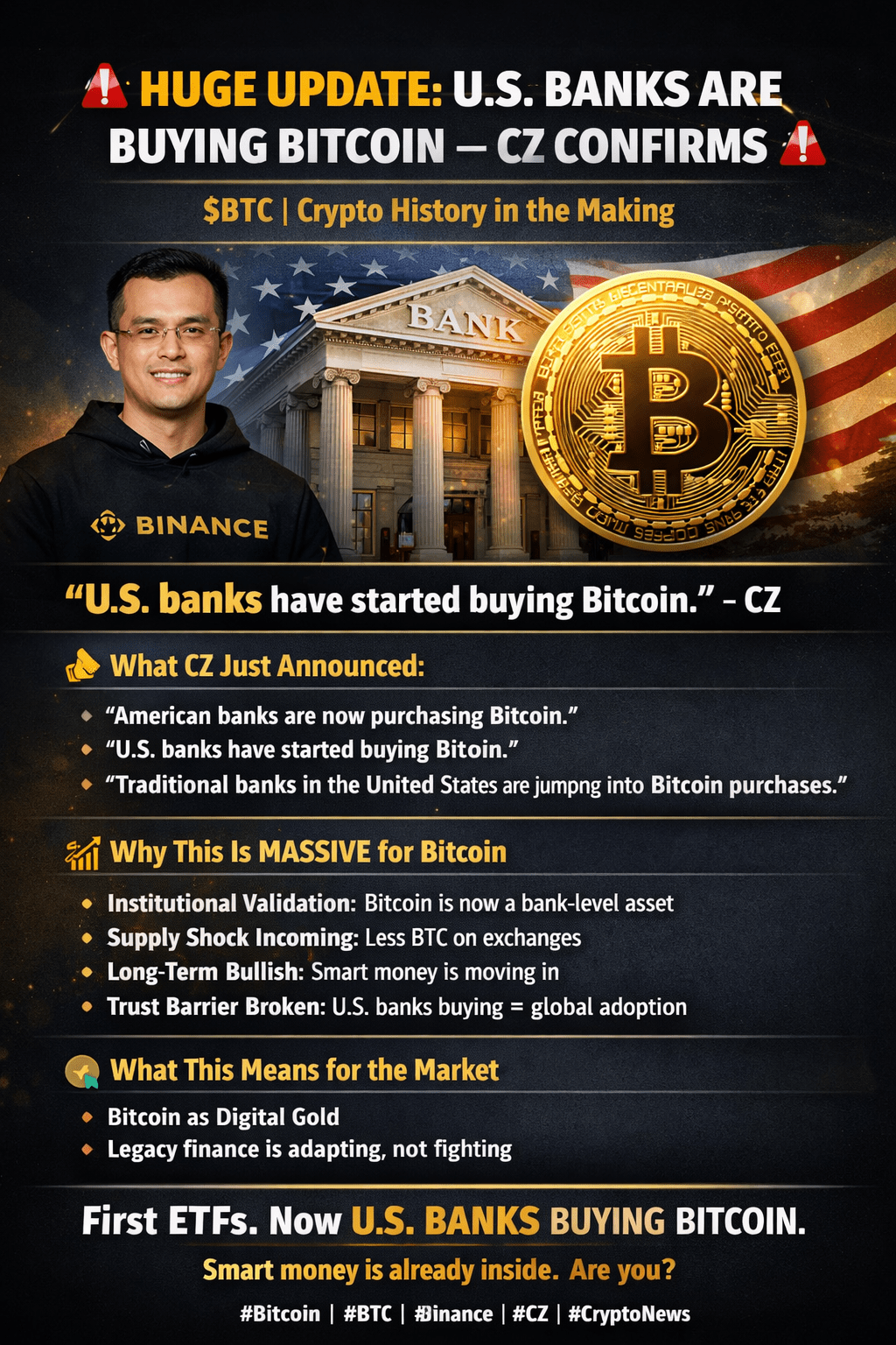Pendiri Binance, Changpeng Zhao (CZ), secara resmi mengungkapkan bahwa bank-bank tradisional Amerika Serikat telah mulai membeli Bitcoin. Ya — bank-bank yang sebelumnya meragukan kripto kini secara aktif membeli $BTC.