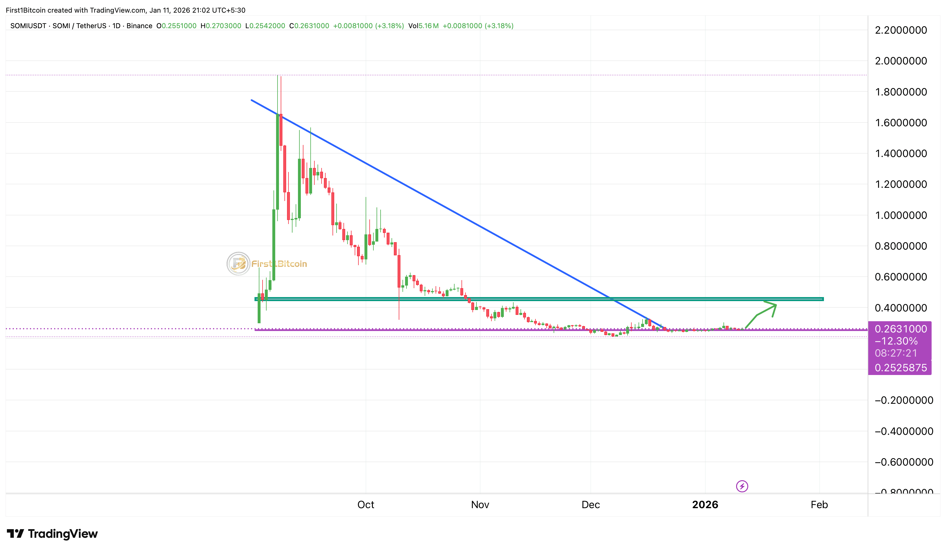 Harga tetap bertahan pada dukungan dasar setelah tren turun yang panjang. #SOMI