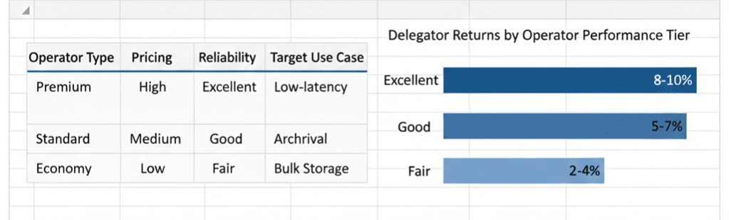Komisi operator dapat dibuat sebagai hasil dari penawaran kompetitif di mana penyedia menawarkan tingkat layanan yang berbeda. Operator yang dioptimalkan kinerja menetapkan harga tinggi untuk aplikasi yang sensitif terhadap latensi, sementara penyedia yang berfokus pada kapasitas menekankan ekonomi penyimpanan dalam jumlah besar. Mekanisme lelang Walrus memilih harga berdasarkan penawaran harga yang dipengaruhi oleh jumlah staking agar tidak terjadi penurunan harga secara predator karena pembentukan pasar yang rasional. Evolusi keragaman infrastruktur secara alami terjadi ketika penyedia fokus pada niche yang menguntungkan dalam tumpukan protokol bersama.
