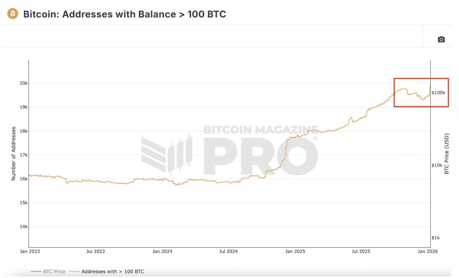 Peningkatan jumlah alamat yang memiliki lebih dari 100 BTC biasanya mencerminkan fase akumulasi cerdas dari pemain besar.