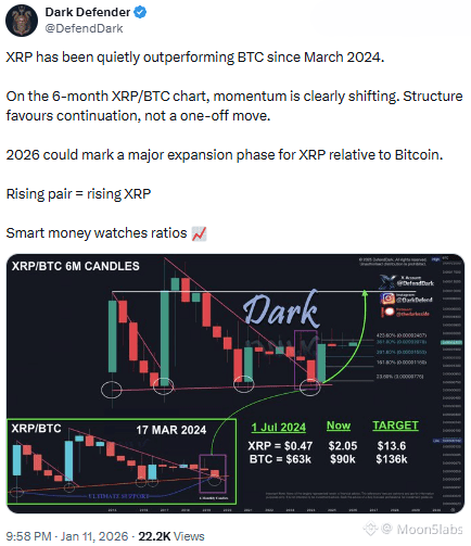 Based on Fibonacci projections, the XRP/BTC pair could reach up to 0.00002487 BTC, a level seen during previous cycle highs. Dark Defender even speculates that with BTC at $136,000, XRP could hit $13.60—though this remains entirely hypothetical.
