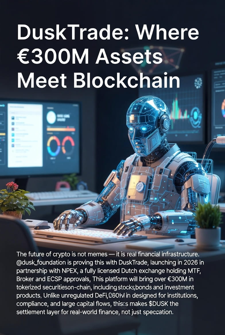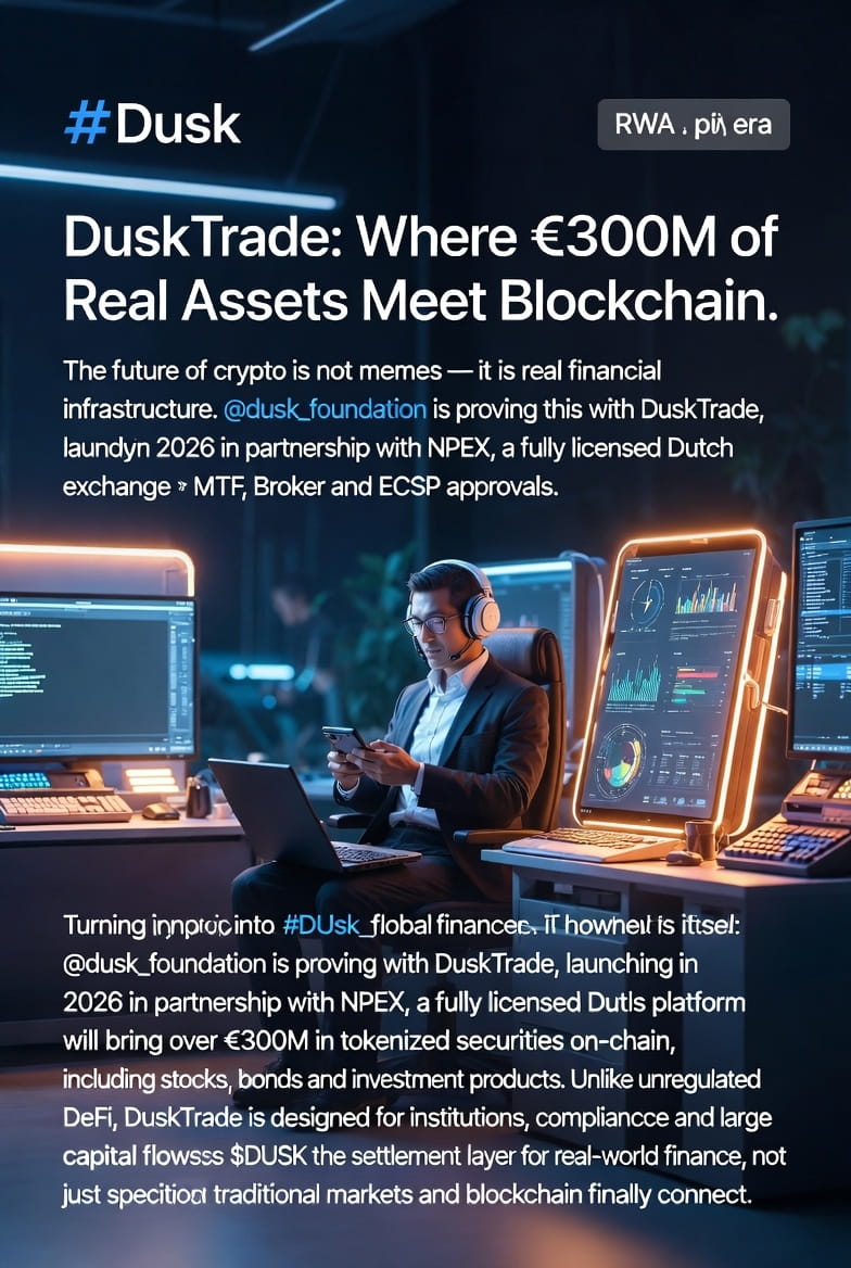 Masa depan kripto bukanlah meme — melainkan infrastruktur keuangan nyata. @Dusk membuktikan hal ini dengan DuskTrade, yang akan diluncurkan pada tahun 2026 bekerja sama dengan NPEX, bursa Belanda yang sepenuhnya berlisensi dan memiliki persetujuan MTF, Broker, dan ECSP.