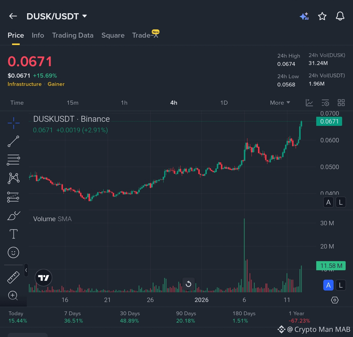 $DUSK is showing serious strength right now! As of today (Jan 12, 2026), the token is trading at around $0.0671 on Binance (DUSK/USDT), marking a solid +15.69% pump in the last 24 hours.