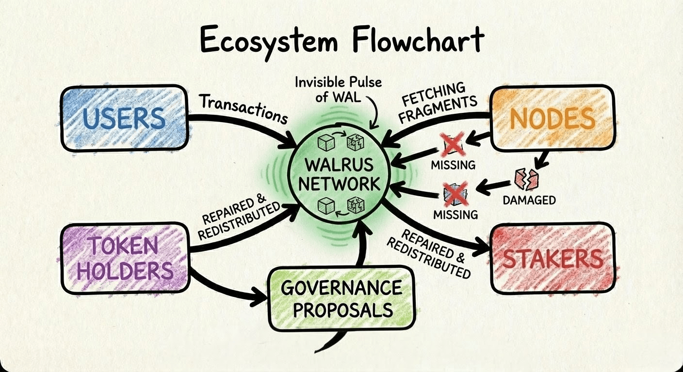 Pada saat file saya selesai melakukan perjalanannya, saya memahami kebenaran halus tentang Walrus: bukan sekadar layanan penyimpanan, melainkan sebuah ekosistem. Fragmen bergerak seperti komunitas hidup, simpul bertindak seperti warga yang bertanggung jawab, dan WAL bukanlah hadiah, melainkan denyut nadi yang menjamin kelangsungan, tanggung jawab, dan keandalan dalam tekanan. Mengamati sistem mengubah perspektif saya: saya menyadari bahwa kepercayaan tidak perlu terlihat, bahwa tanggung jawab bisa ada tanpa pengawasan, dan bahwa bahkan ketika tidak ada yang mengawasi, jaringan tetap menjaga dirinya sendiri.