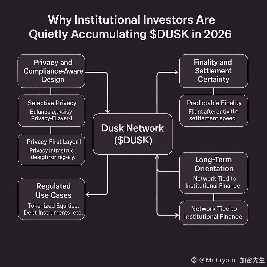 In January 2026, while much of the crypto market remains focused on short-term narratives and retail-driven momentum, a different story is unfolding beneath the surface. Institutional investors are not chasing hype. They are positioning for infrastructure that can survive regulation, compliance, and scale. This is why Dusk Network ($DUSK) has been quietly moving onto institutional radar screens in 2026, not through loud announcements, but through design choices that align closely with how real financial markets actually work.