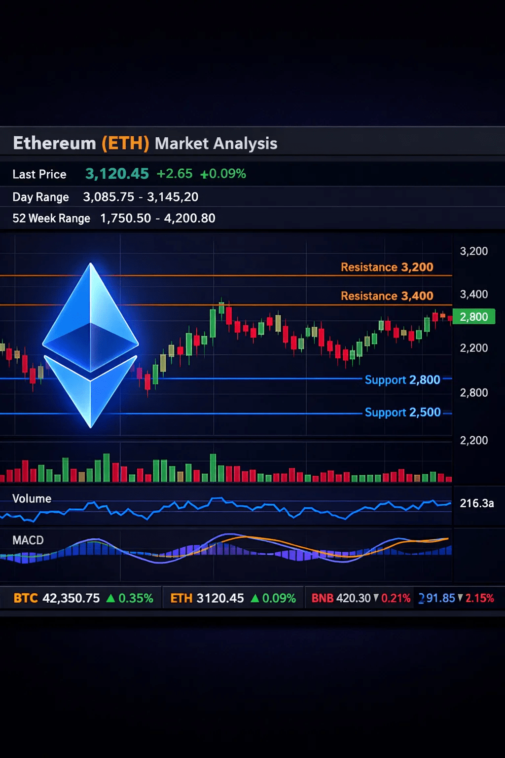 $ETH sedang berada di atas support utama di sekitar ~$3.100–$3.200 saat mengkonsolidasikan dalam pasar yang sempit, dengan analis mencatat sinyal teknis yang bisa mendorong kenaikan lebih lanjut jika resistance terobos.