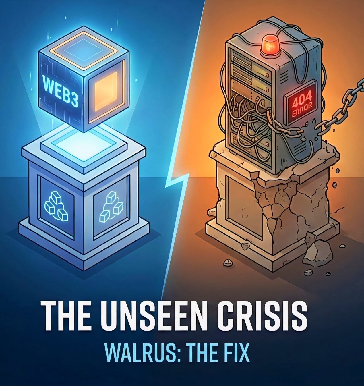 Anda membeli NFT dari karya seni digital. Rekor transaksi—kwitansi yang menyatakan "Pengguna X memiliki Token Y"—adalah tidak dapat diubah dan hidup di blockchain. Tetapi gambar itu sendiri? JPEG resolusi tinggi atau file video MP4? Dalam terlalu banyak kasus, file itu hidup di server terpusat. Itu hidup di Amazon Web Services (AWS). Itu hidup di tautan Dropbox. Jika server terpusat itu mati, atau jika perusahaan berhenti membayar tagihan hostingnya, aset "tidak dapat diubah" Anda menjadi kesalahan 404. Anda memiliki kwitansi, tetapi barang-barangnya hilang.