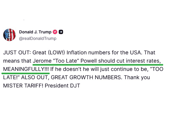 Setelah laporan CPI terbaru keluar lebih rendah dari perkiraan, Donald Trump memuji data inflasi sebagai 'indah (LOW!)' dan secara terbuka meminta Ketua The Fed Jerome Powell untuk menurunkan suku bunga SEKARANG.
