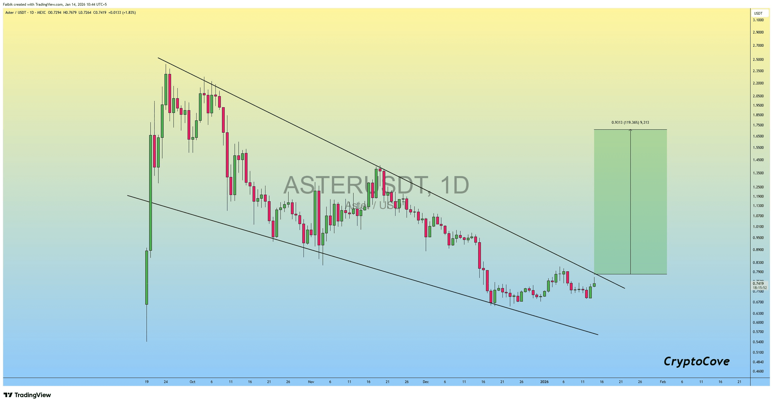 $ASTER /USDT menunjukkan setup bullish probabilitas tinggi pada grafik harian, tergantung pada breakout wedge turun yang telah dikonfirmasi. Kesabaran dan manajemen risiko yang tepat sangat penting.