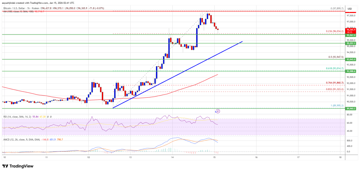 Lihat bagaimana situasinya agar kalian tidak ketinggalan: Bitcoin mendapat kecepatan, menembus ambang $95.500 dan mencapai level tertinggi sebesar $97.898. Hampir menyentuh $98k! 📈 Saat ini, harga sedang beristirahat dan mengumpulkan kekuatan. Yang paling penting di sini adalah BTC tetap berada di atas moving average 100 jam, yang secara bahasa kita artikan sebagai tren masih kuat ke atas dan pembeli tetap mengendalikan kendali. 🚢