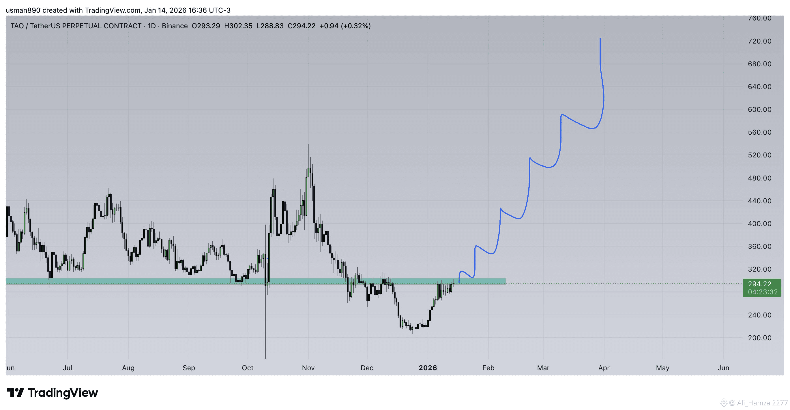 The TAO/USDT perpetual contract on the daily timeframe is showing strong bullish expansion potential after an extended consolidation phase near a key structural support. Price action suggests that TAO is preparing for a high-momentum breakout, with a bullish projection pointing toward a significant upside continuation.