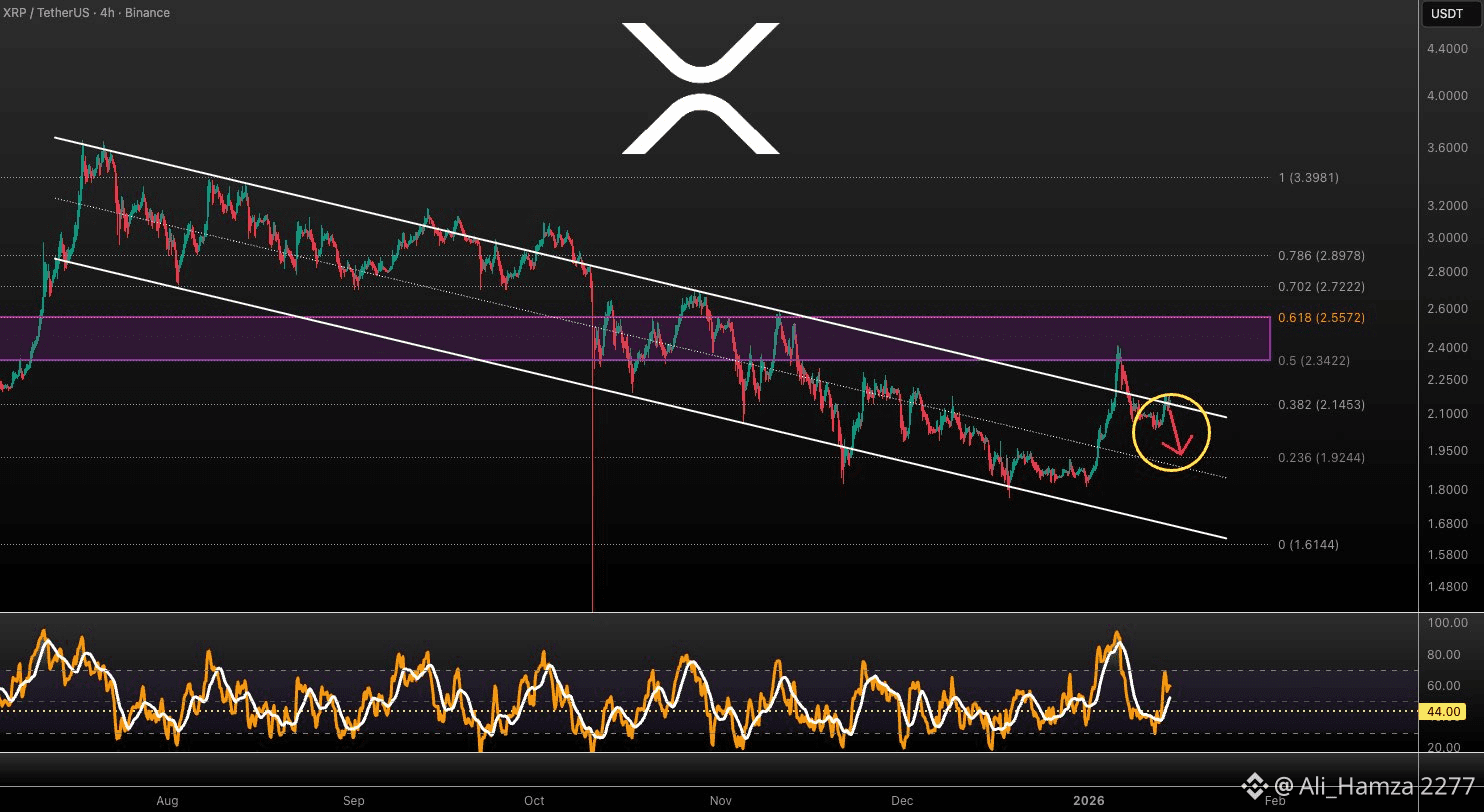 $XRP continues to trade under pressure as price remains confined within a well-defined descending channel on the 4-hour timeframe. Despite minor recovery attempts, the market has failed to produce a confirmed breakout, keeping the short-term bias bearish.