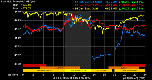 Sejak 15 Januari 2026, harga spot XAU/USD diperdagangkan sekitar $4.585–$4.600 setelah sedikit turun dari rekor tertinggi baru kemarin sebesar ~$4.643. Itu berarti kenaikan +6–7% sejak awal tahun, menyusul kenaikan luar biasa ~65–69% pada tahun 2025. Kita sedang berada dalam mode penemuan harga penuh – dan pemicu-pemicu terus menumpuk cepat!