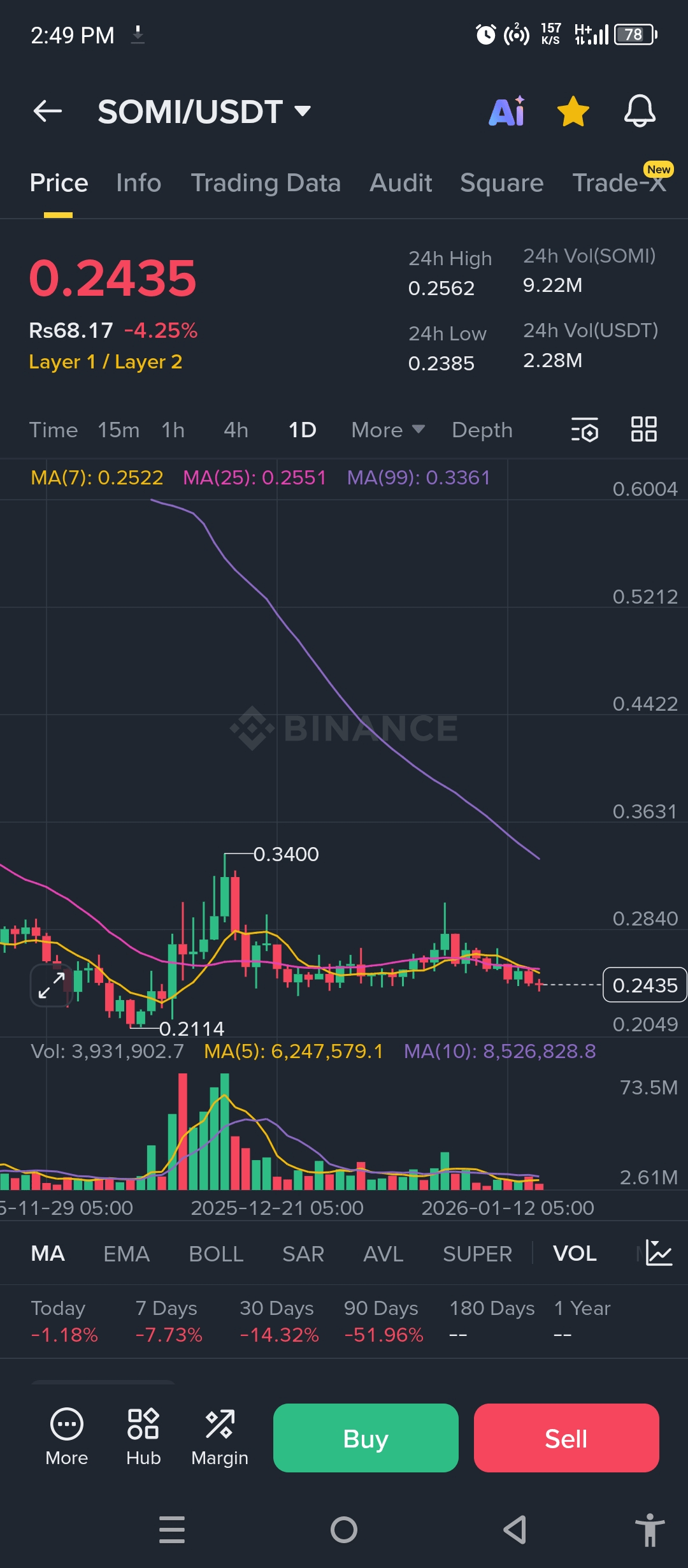 Ada tekanan SOMI saat ini dan tren turun yang jelas terlihat pada timeframe harian. Harga berdagang sekitar 0.24 USDT yang berada di bawah rata-rata bergerak jangka pendek ā ini menunjukkan kekuatan penjual.