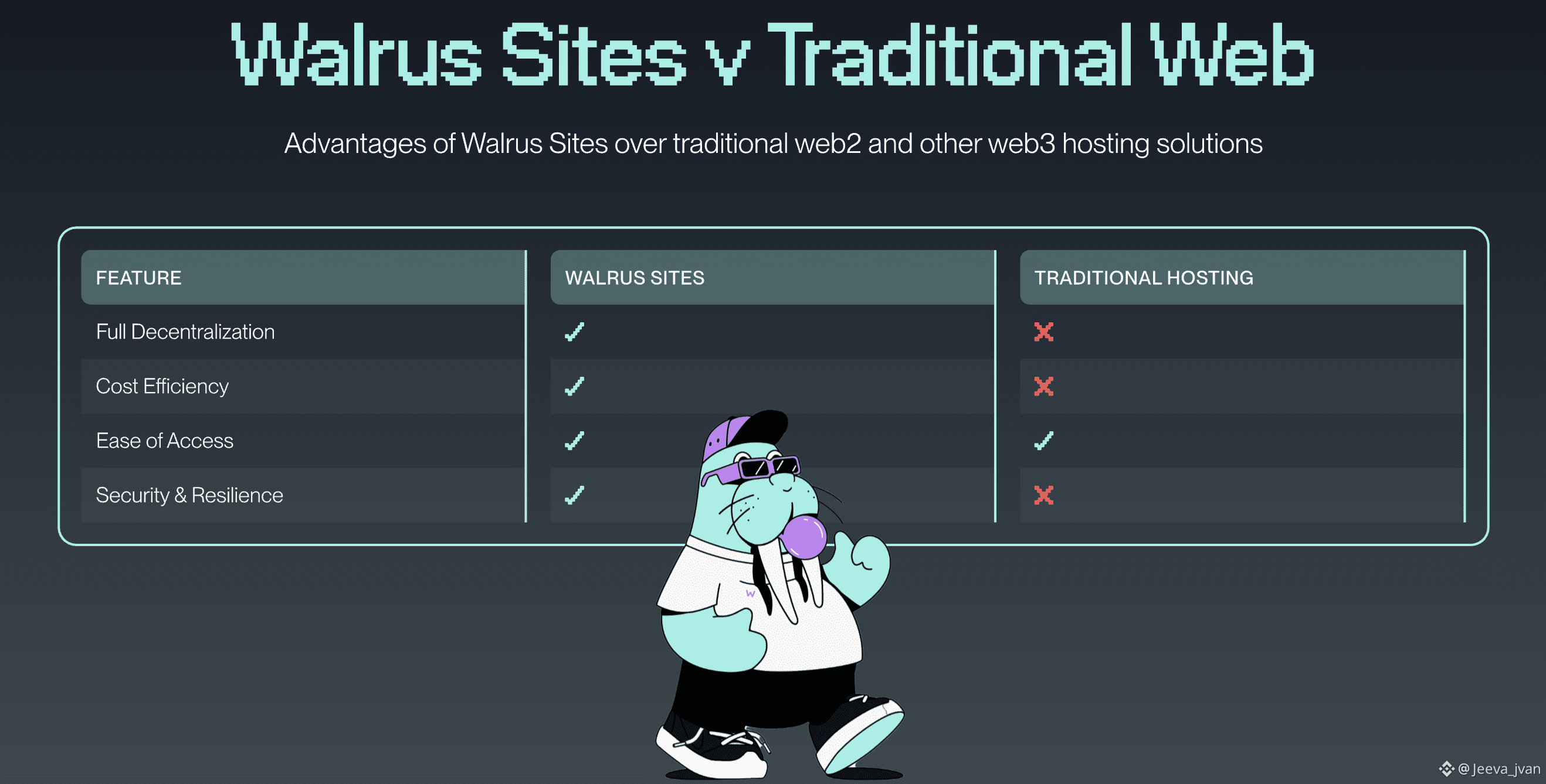 Walrus Sites align infrastructure with Web3 values. They provide full decentralization, strong security, predictable costs, and global accessibility without relying on centralized intermediaries. While traditional hosting may still serve simple use cases, it is fundamentally incompatible with the trustless, permissionless future the internet is moving toward.