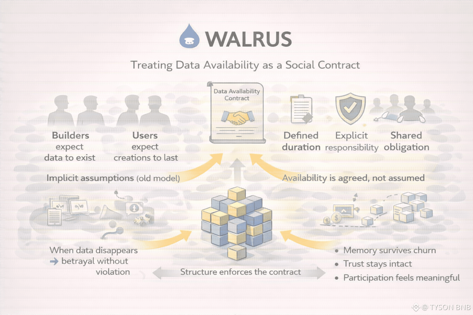 Decentralized systems succeed not only because of code, but because of shared expectations. By treating data availability as a social contract rather than a background assumption, Walrus strengthens the bond between infrastructure and the people who depend on it.