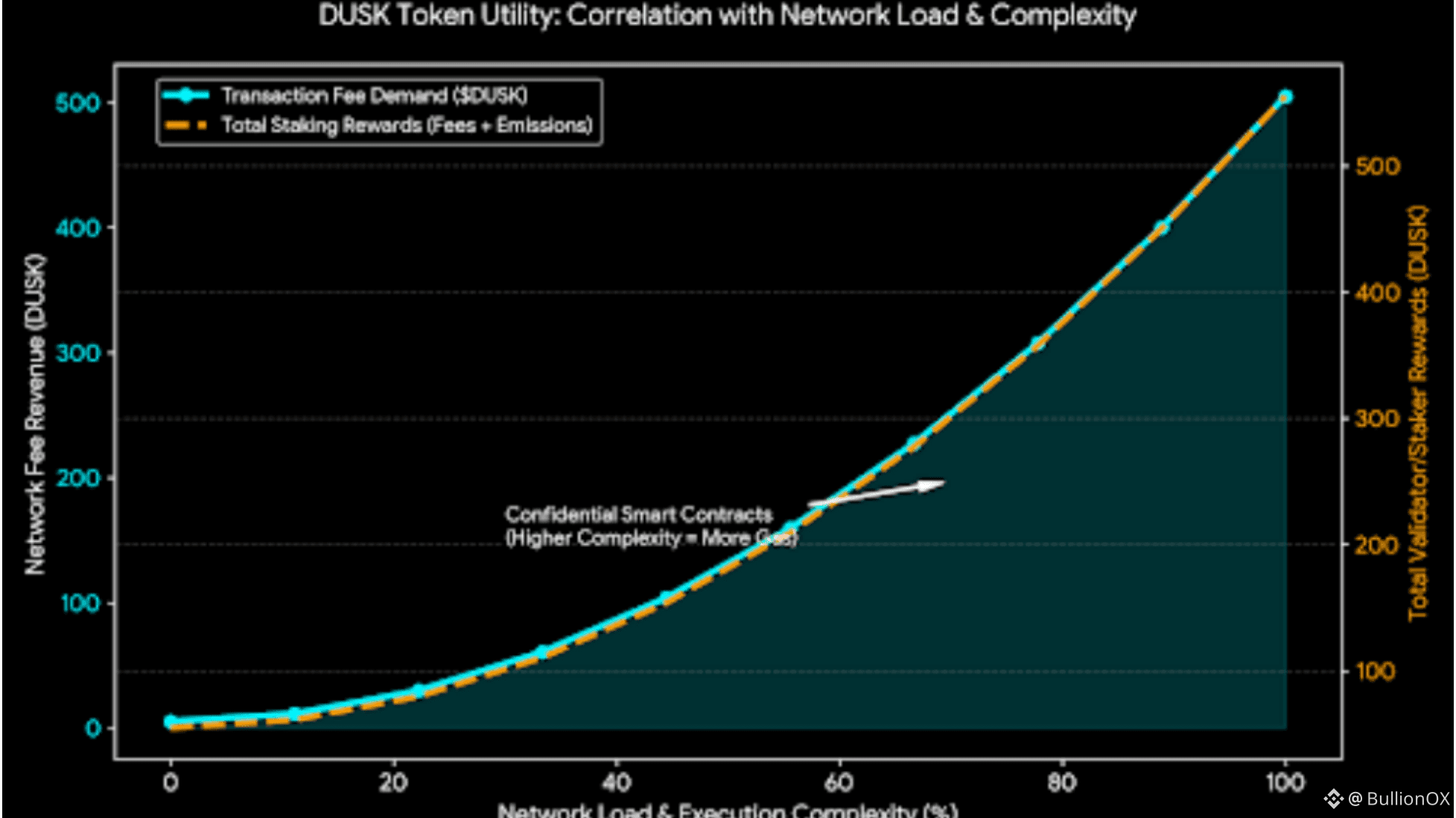 On the staking side, Dusk's Proof-of-Blind-Bid consensus depends on people locking Dusk so help secure the network. Stakers earn rewards from both new token emissions (spread over 36 years) and the transaction fees collected. When network load grows and execution gets more complex, more fees flow into the system. This increases rewards for those who stake, creating a positive cycle where higher usage makes staking more attractive. It encourages people to hold and participate long term, strengthening the network's security.
