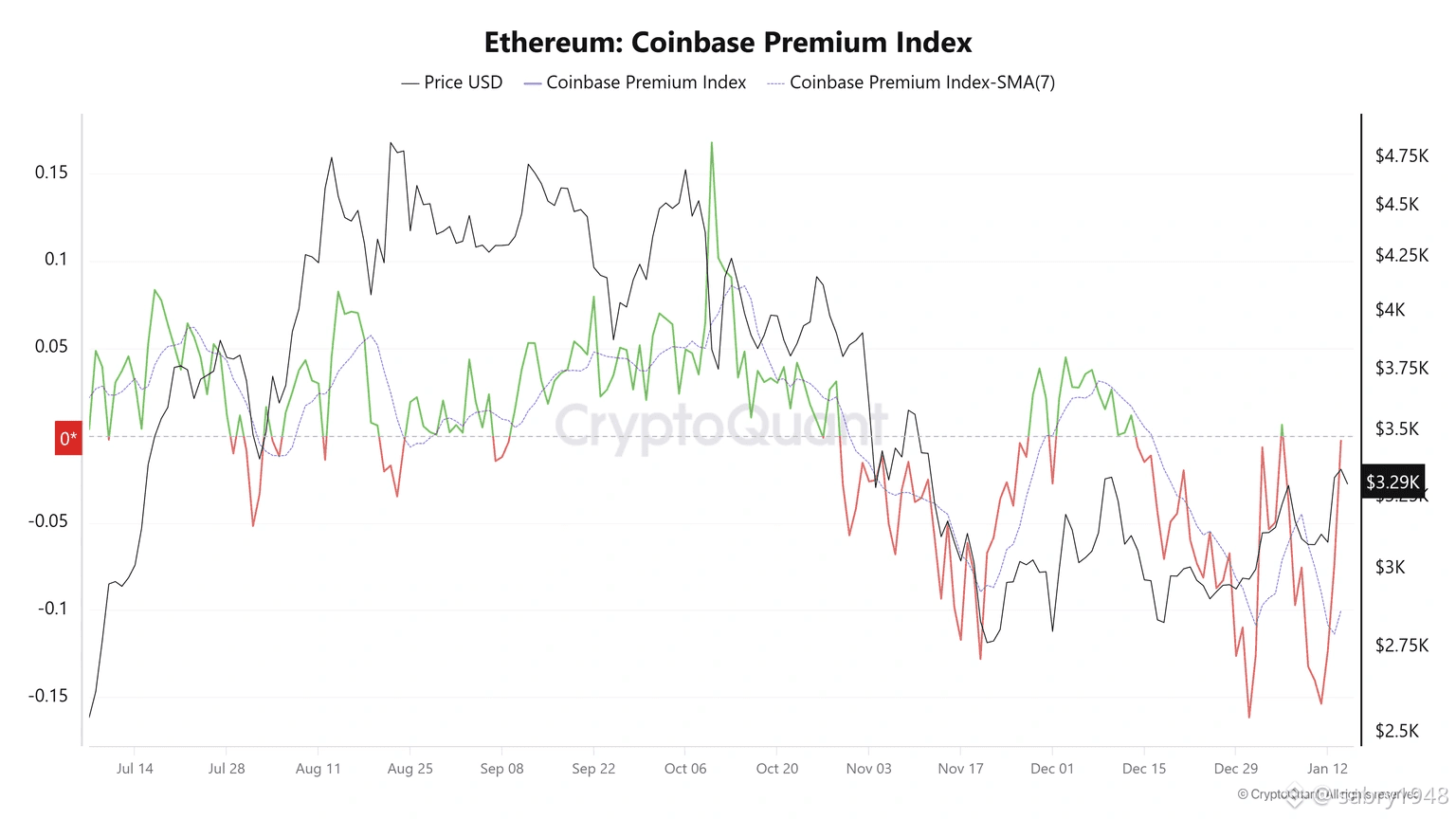 كما انخفضت الفائدة المفتوحة (OI) في عقود الإيثريوم بمقدار 140 ألف ETH خلال الثلاثة أيام الماضية رغم ارتفاع السعر، حسب بيانات Coinglass، مما يؤكد أن الارتفاع لم يكن مدفوعاً بالمشتقات بل بالطلب الفوري. في المقابل، عاد مستثمرو الولايات المتحدة إلى الشراء النشط في السوق الفوري، حيث اقترب مؤشر Coinbase Premium من التحول إلى الإيجابي بعد ارتفاع ETH خلال الأيام الثلاثة الماضية. يقيس هذا المؤشر الفرق النسبي بين أسعار ETH على Coinbase Pro (بالدولار) وبينانس (بالـ USDT).
