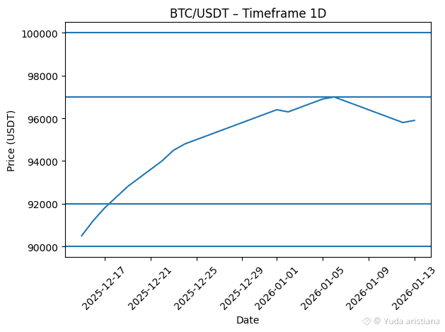 BTC/USDT timeframe harian masih bergerak dalam fase konsolidasi di bawah resistance $97K–$100K, dengan support kuat di area $90K–$92K. Struktur ini sering menjadi fondasi sebelum breakout lanjutan.