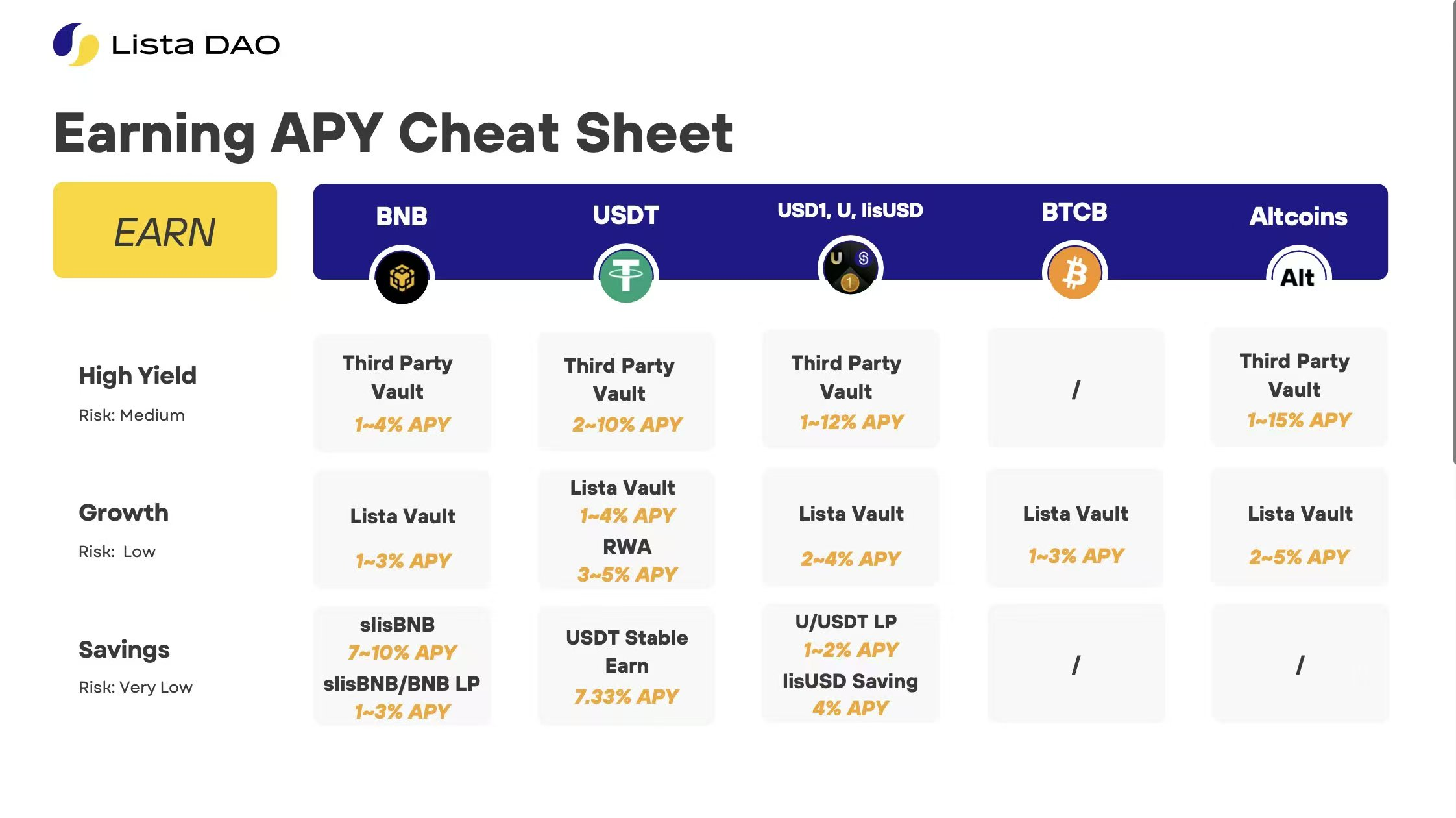 当然它的收益表也相当实在:从极低风险的储蓄(比如USDT稳定币收益7.33% APY),到低风险的增长型策略(比如USD1生态的Lista Vault 2-4% APY),再到中等风险的高收益选项(比如第三方Vault给USD1带来1-12% APY),不同风险偏好的玩家都能找到适合自己的位置。