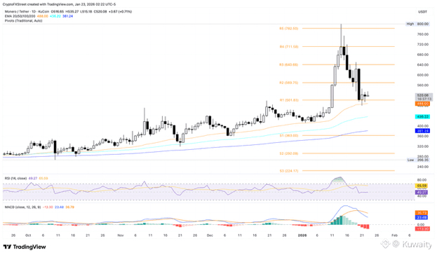 مونيرو مستقر فوق 500 دولار، مع تحديد المتوسط المتحرك الأسي لمدة 50 يومًا للاتجاه الهبوطي.