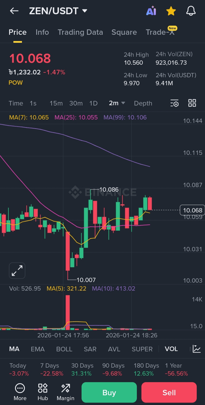 Hari ini, menurut grafik tanggal 24 Januari 2026, ZEN/USDT saat ini diperdagangkan di $10.068, yang turun -1.47% dalam 24 jam terakhir. Analisis grafik menunjukkan bahwa setelah penurunan besar, pasar sekarang mencoba untuk stabil.