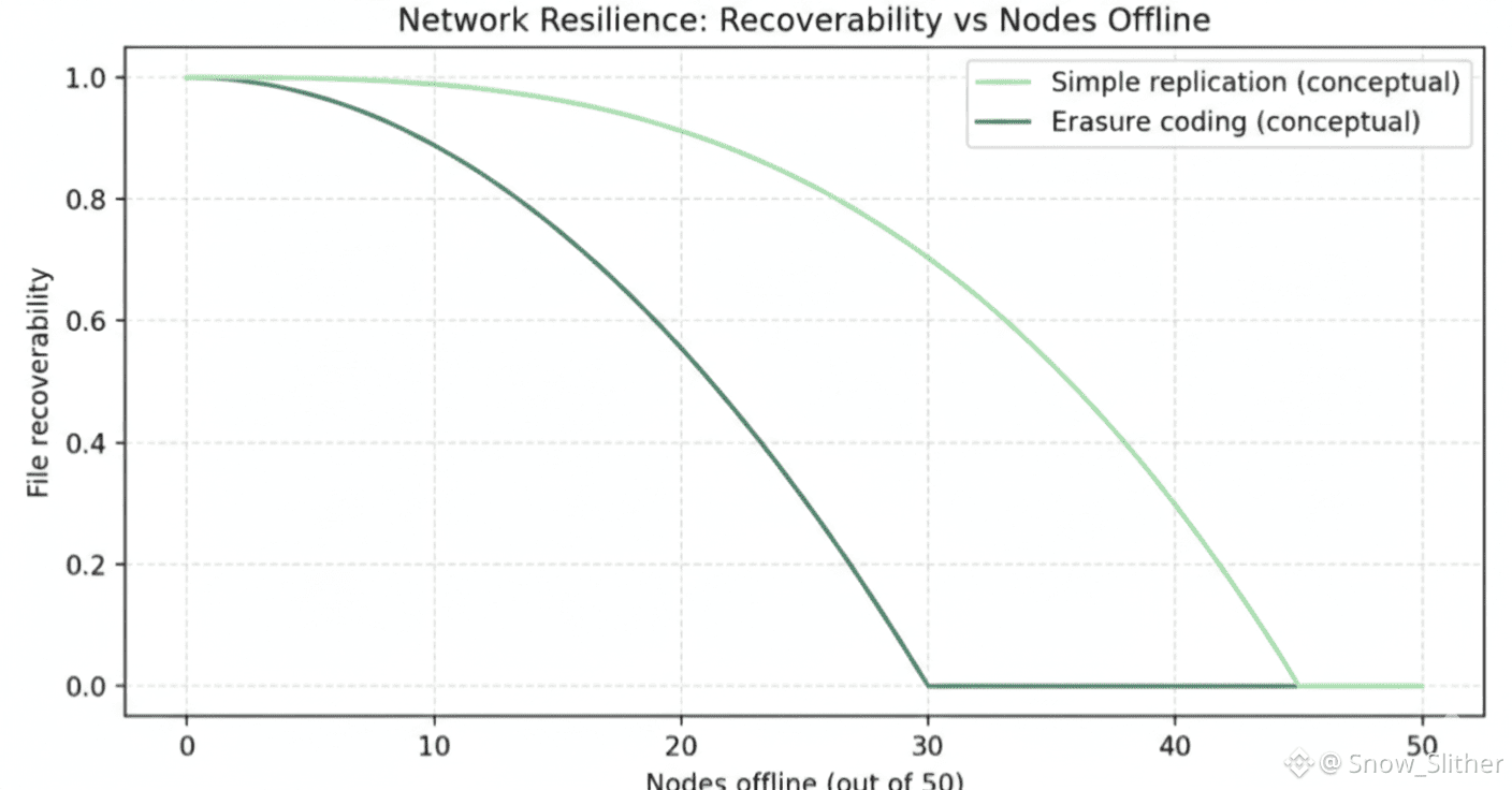 Walrus flips that model. Instead of storing data in one place, it breaks large files into pieces and spreads them across many independent storage providers. This network is permissionless, meaning anyone can participate if they follow the rules. There is no single owner of the data, no central switch to turn off.Because the data is distributed, the system doesn’t rely on every single node being online at the same time. Even if some nodes fail or leave, the data can still be recovered. Availability comes from the network as a whole, not from one strong server.