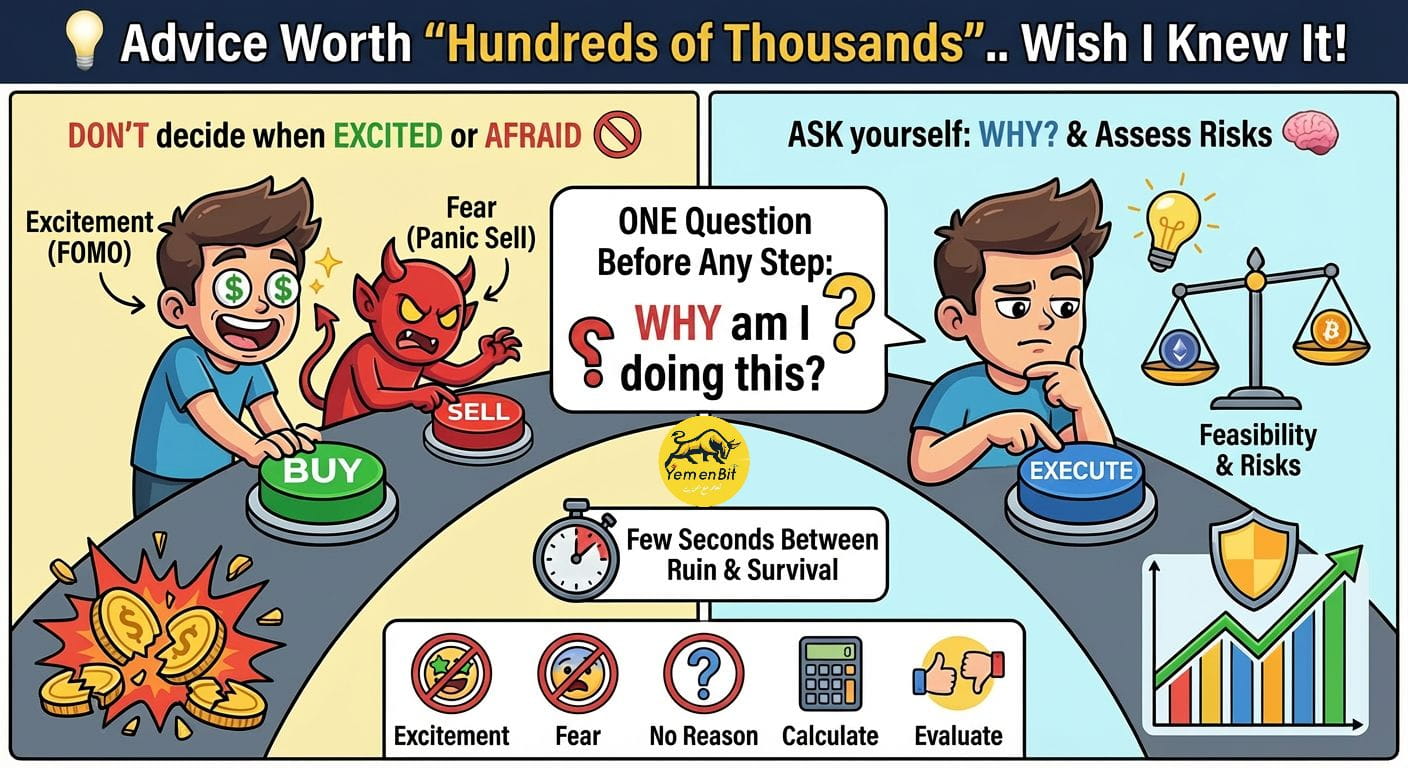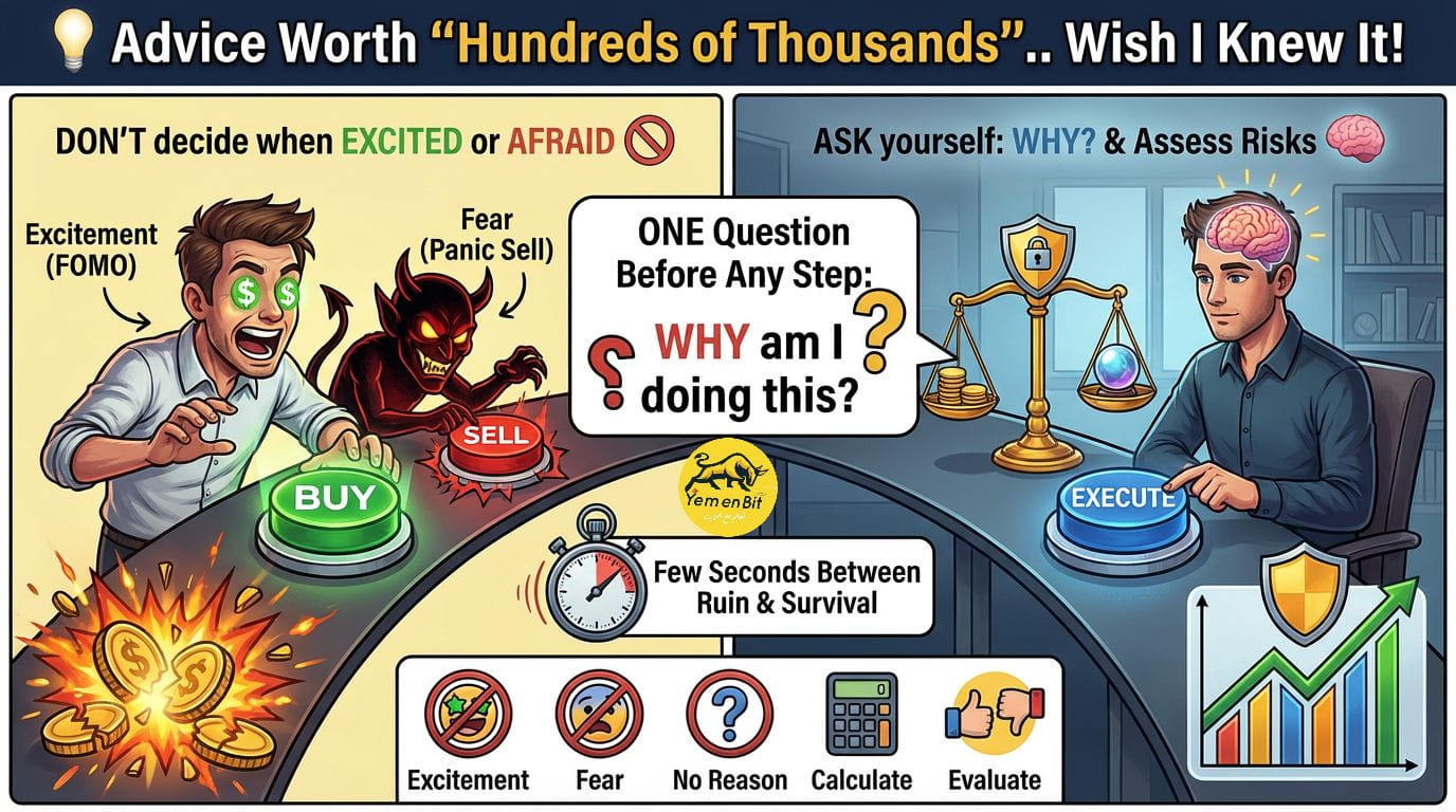 1️⃣ عند الشراء: ما هو دافعك الحقيقي؟ هل هو تحليل فني واضح؟ أم مجرد ملاحقة للشموع الخضراء (FOMO)؟
