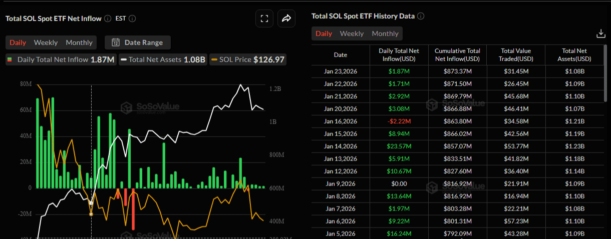 Saat ini, SOL diperdagangkan di sekitar $126,75. Meskipun harga menunjukkan sedikit penurunan (-0,33%), dasar yang dibangun oleh aliran ETF sangat kuat.